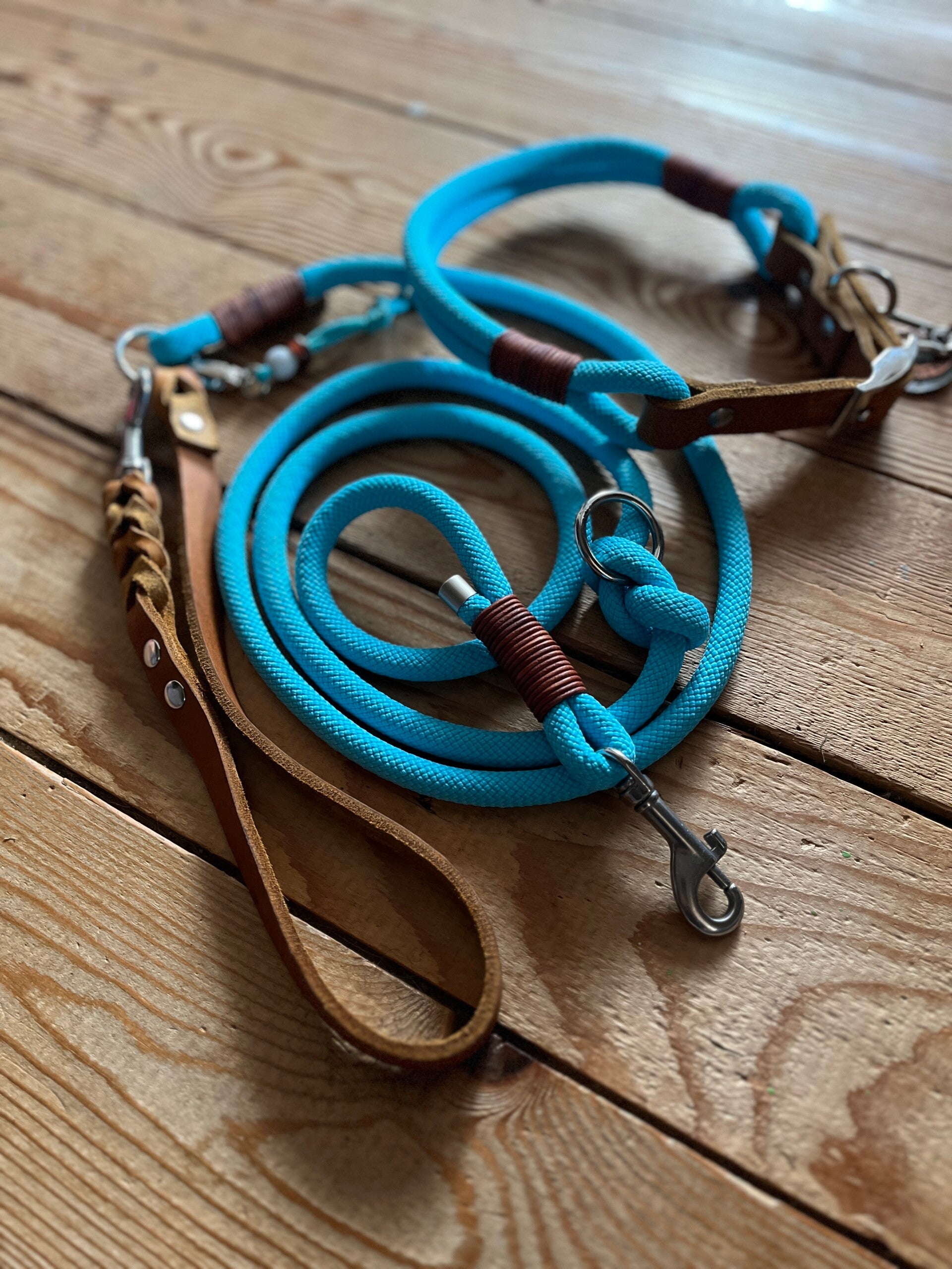 Halsband LAGOON van hoge kwaliteit leer en touw. De verstelbare halsband is gemaakt met messing hardware en kan wel tegen een stootje. Halsband LAGOON is gemaakt van premium touw en robuust cognac vetleer 20mm