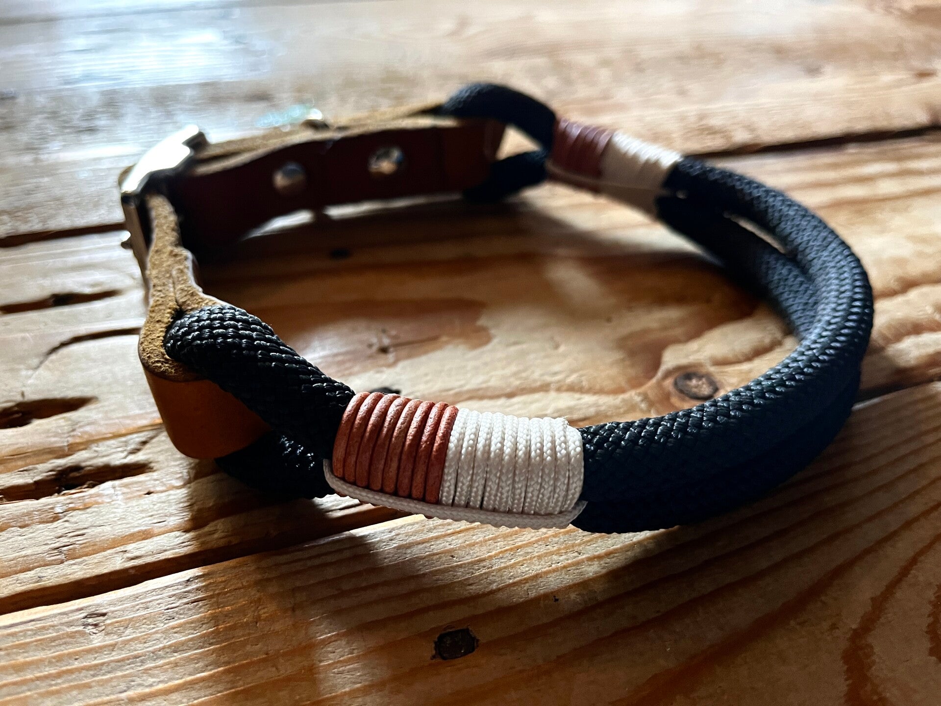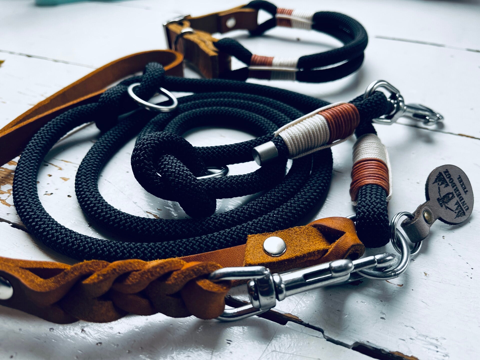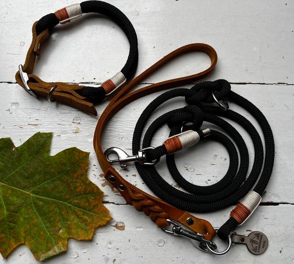 Het zwarte premium touw en de zachte kwaliteit leer, zijn de basis van je nieuwe hondenlijn en halsband. Met de massief roestvrij hardware is dit een echte krachtpatser!