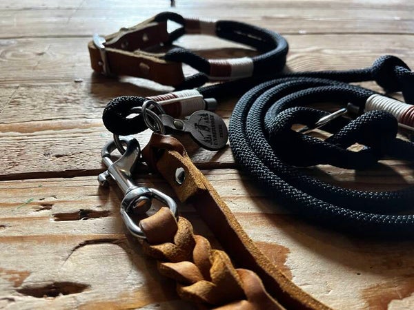De verstelbare halsband, gemaakt met roestvrij hardware, kan wel tegen een stootje. Halsband gemaakt van 10mm premium touw en robuust geolied cognac leer.